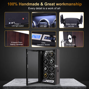 Matériau : le remontoir automatique DUKWIN pour 6 montres est fabriqué à 100 % en bois fait à la main avec une fenêtre en verre organique acrylique, un extérieur élégant piano brillant et un intérieur en cuir végétalien.