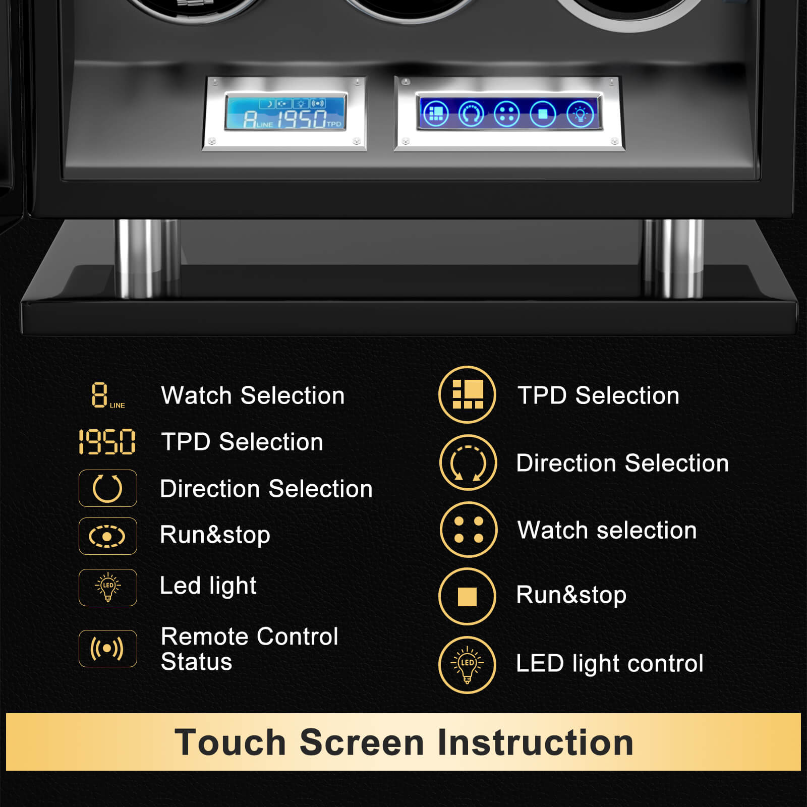 • Écran LCD et télécommande : l'écran tactile LCD vous permet de régler chaque remontoir selon les paramètres souhaités pour votre montre. Vous pouvez également le contrôler à distance, ajuster facilement les programmes et allumer/éteindre la lumière sans ouvrir la porte.