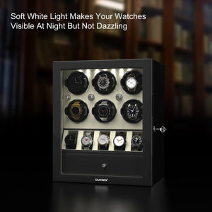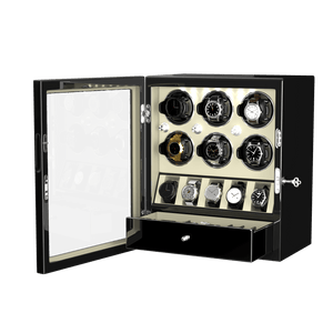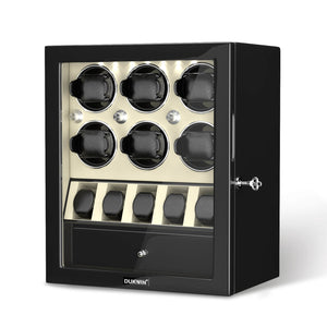- Ce remontoir classique Dukwin pour 6 montres est la solution idéale pour remonter jusqu'à 6 montres simultanément, avec un rangement pour 5 autres. Le tout est présenté dans un élégant coffret de présentation fermé. Fidèle à notre engagement constant pour une conception et une ingénierie de qualité, ce remontoir pour 6 montres intègre de nombreuses fonctionnalités luxueuses qui le distinguent des autres.