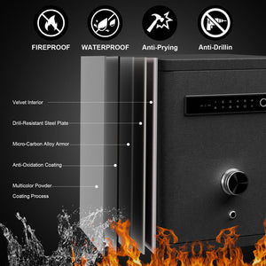 Pesant 45 kg (100,31 lbs) net et 57 kg (125,66 lbs) avec son emballage, ce coffre-fort allie un poids conséquent à une construction sans compromis pour une sécurité renforcée. Fabriqué avec une structure entièrement en acier, un panneau de porte massif, des verrous de précision en acier et un revêtement anti-oxydation, il est par ailleurs équipé d'une serrure à combinaison et d'une porte étanche coupe-feu, offrant ainsi une protection exceptionnelle contre les effractions. Attention : ce coffre-fort est conçu pour une utilisation autonome et ne peut être fixé au mur ni encastré.