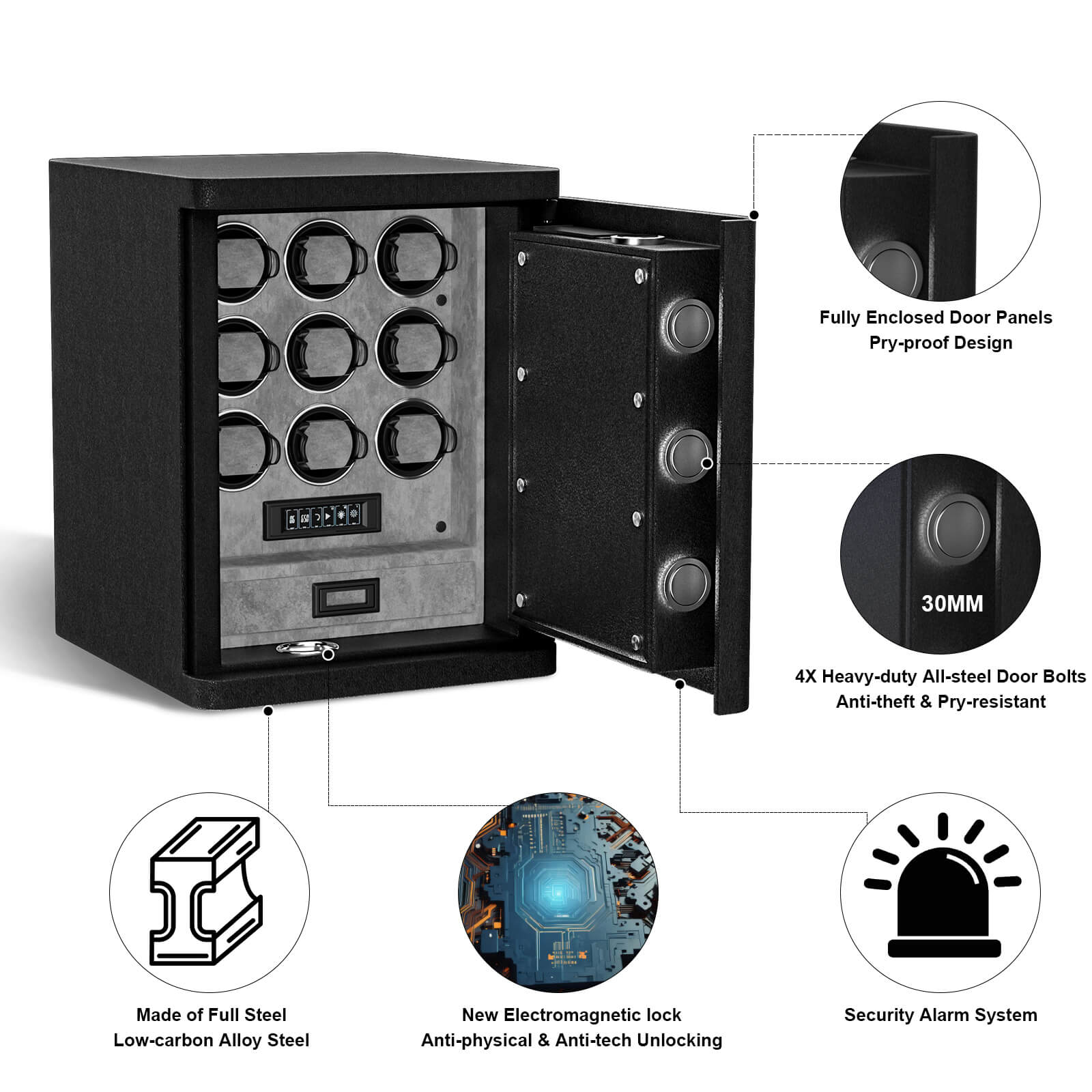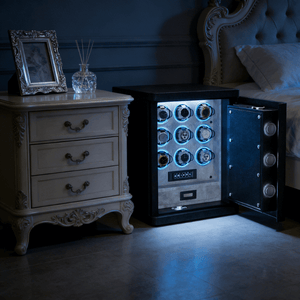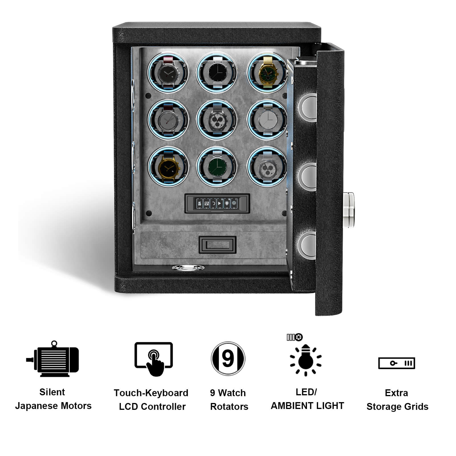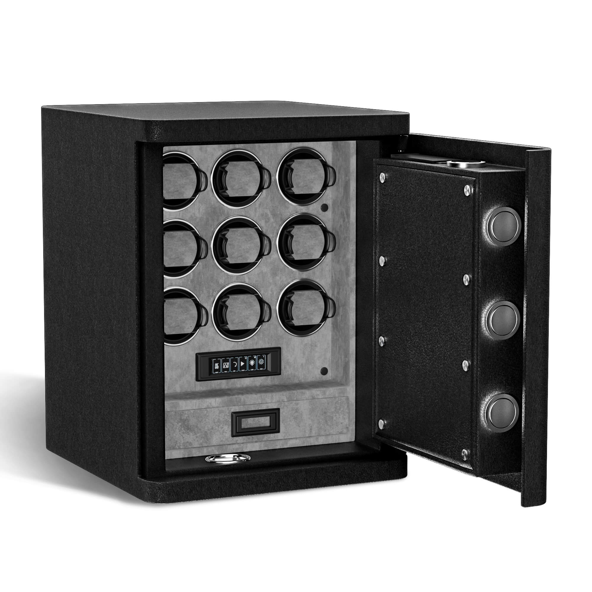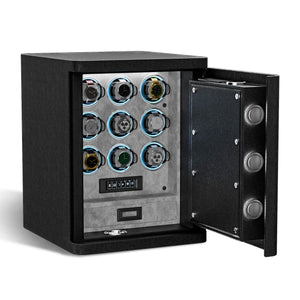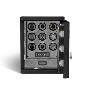 Le coffre-fort remontoir de montres Obsidian Veil Series est un système de remontage multifonctionnel verrouillable à 9 unités avec espace de rangement supplémentaire, conçu pour remonter votre collection de montres de manière sûre et fiable.