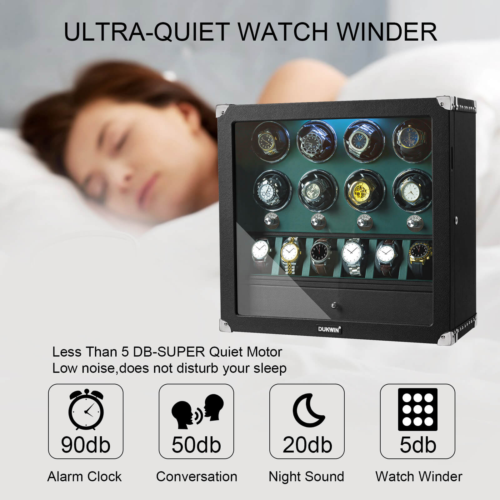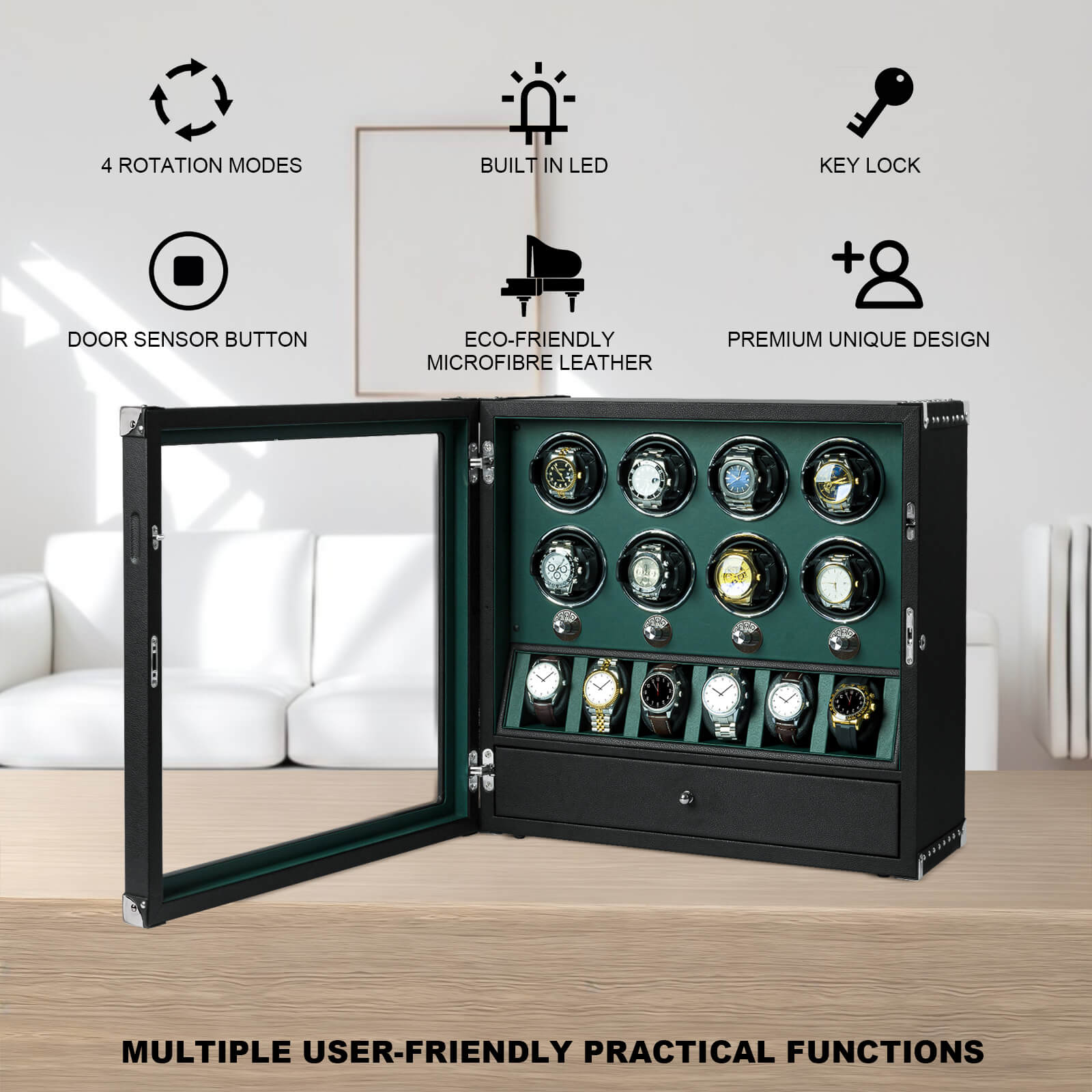 • Matériau : Le remontoir automatique pour 4 montres est fabriqué en bois fait à la main avec une fenêtre en verre organique acrylique, un extérieur élégant en piano brillant et un intérieur en cuir végétalien.