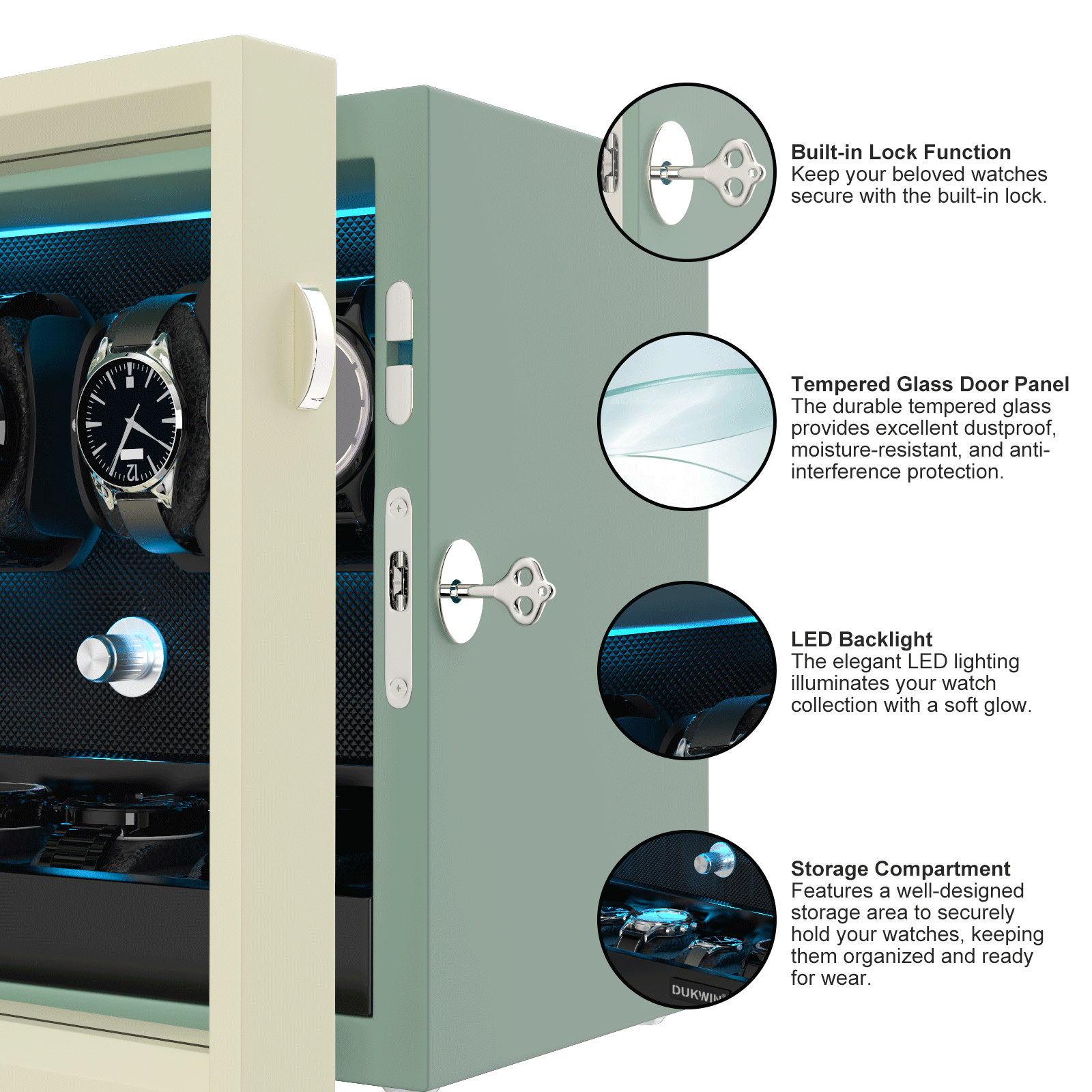 4 + 4 Watch Winder with Extra Storages Aurora Blue Light Quiet Motors - Silken Green