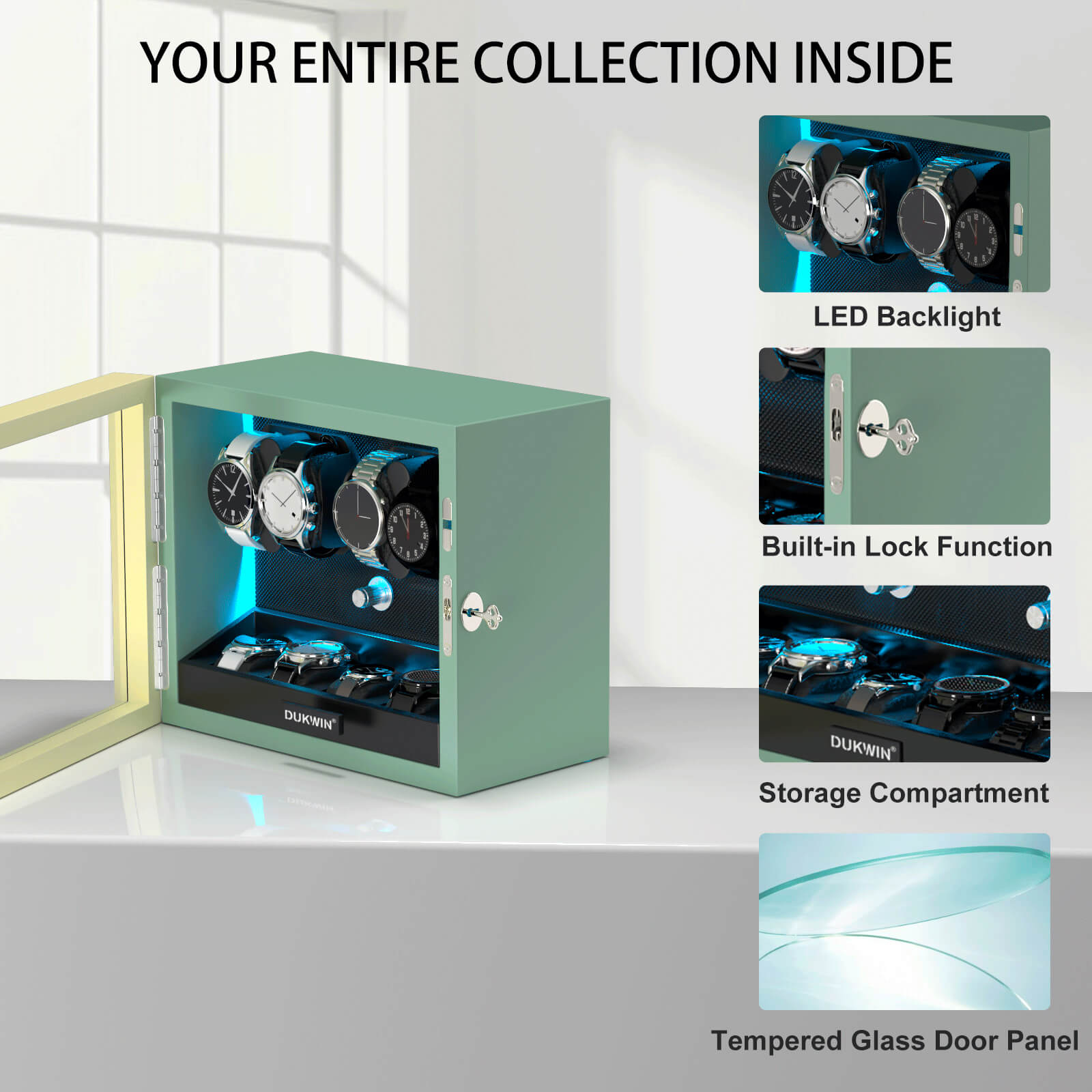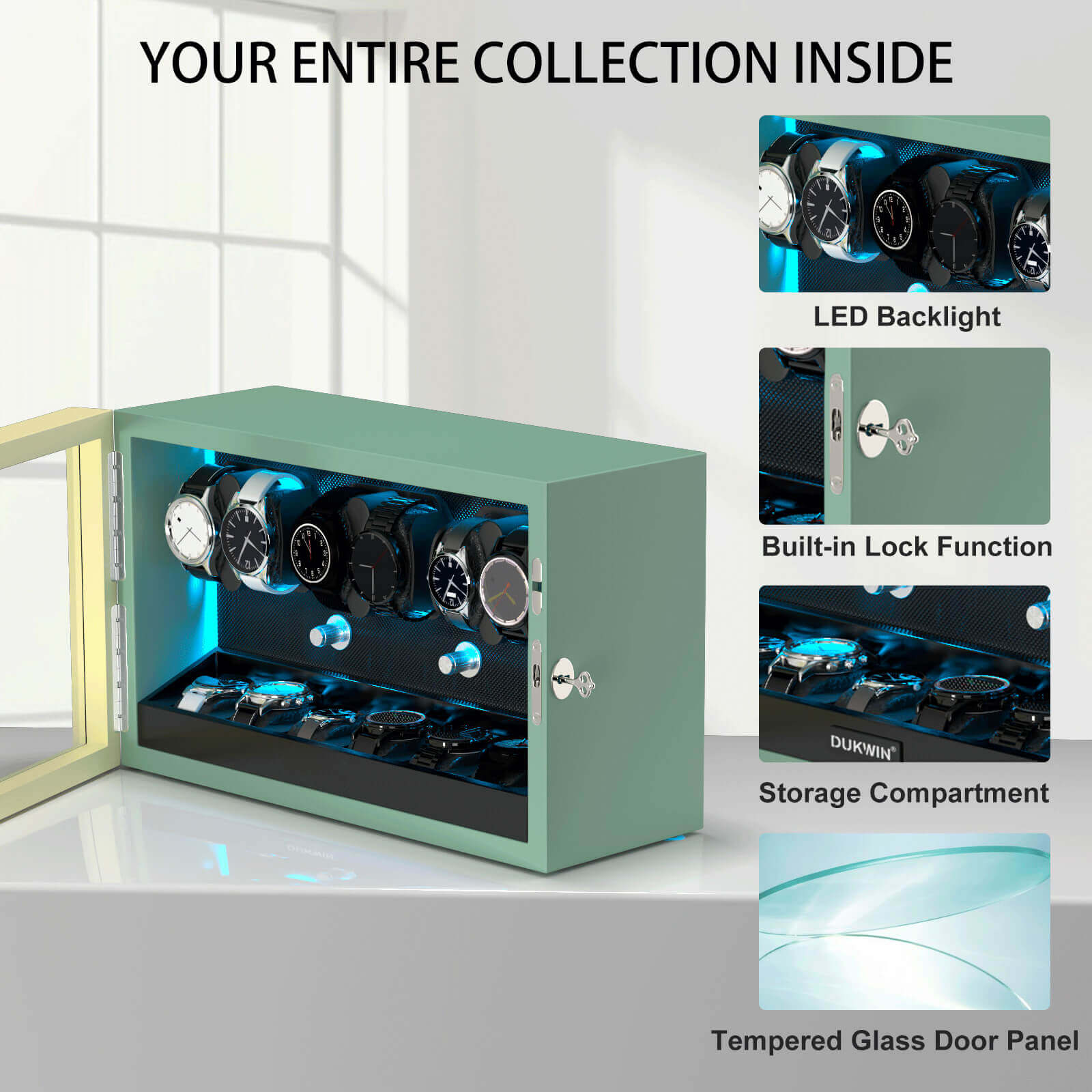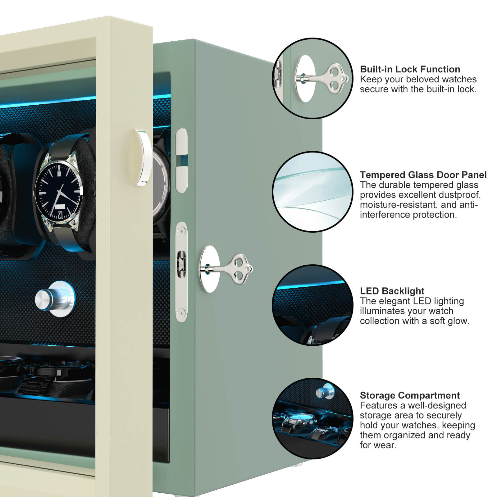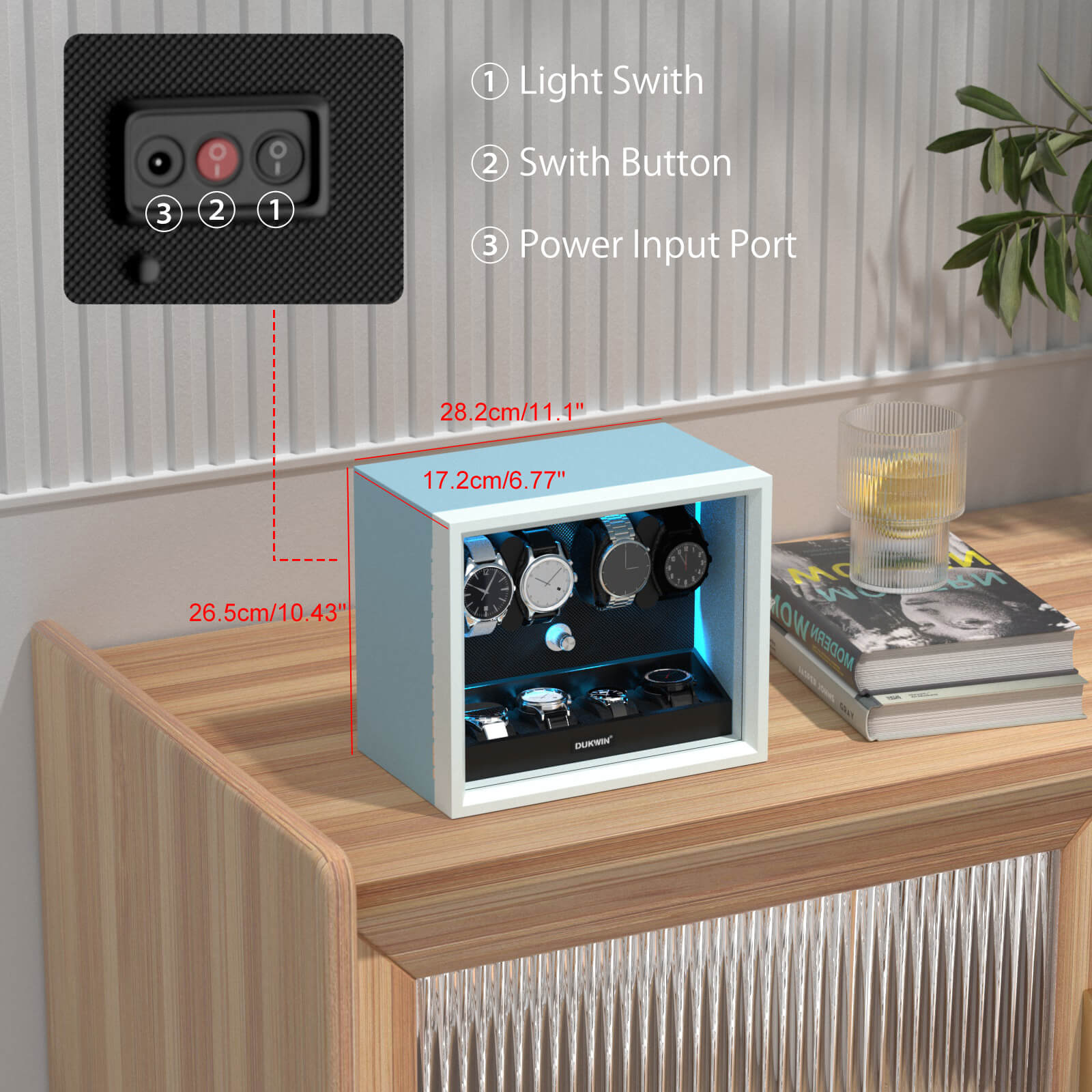 【LED Light Bar】Internal setting the LED light bar, watch winder dark night emitting aurora blue shimmering light.