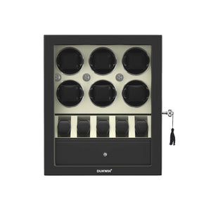 • This classic 6-watch winders from Dukwin presents the ideal solution for winding up to 6 watches at the same time and with a watch deck storage to display your another 5 watches.  All presented in an elegant closed display case.  Showcasing our usual commitment to quality design and engineering, this 6-watch winder incorporates a number of luxury features that make it stand out from the crowd.