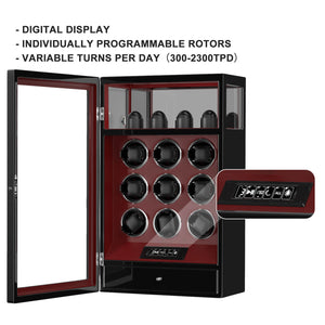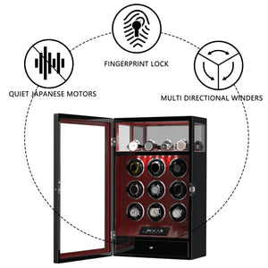 Fingerprint Lock 9 Watch Winders with 4 Watch Holders Storage LCD Remote Control - Red
