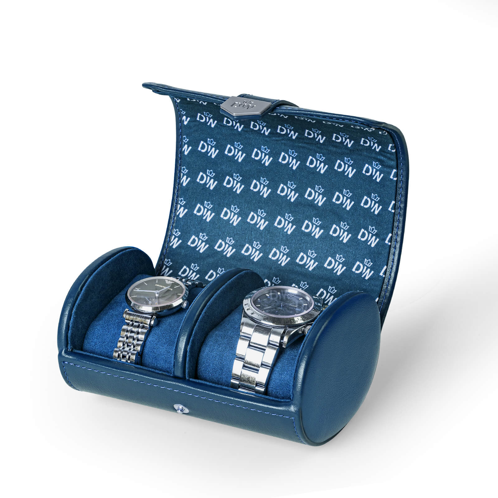 Double Watch Roll is crafted with eco-friendly vegan leather, finished with our signature DUKWIN logo metallic closure. The interior is lined with DUKWIN’s iconic patterned fabric, while the watch cushions are wrapped in soft faux suede. Designed exclusively to hold two watches, this compact roll is perfect for secure travel and everyday storage.