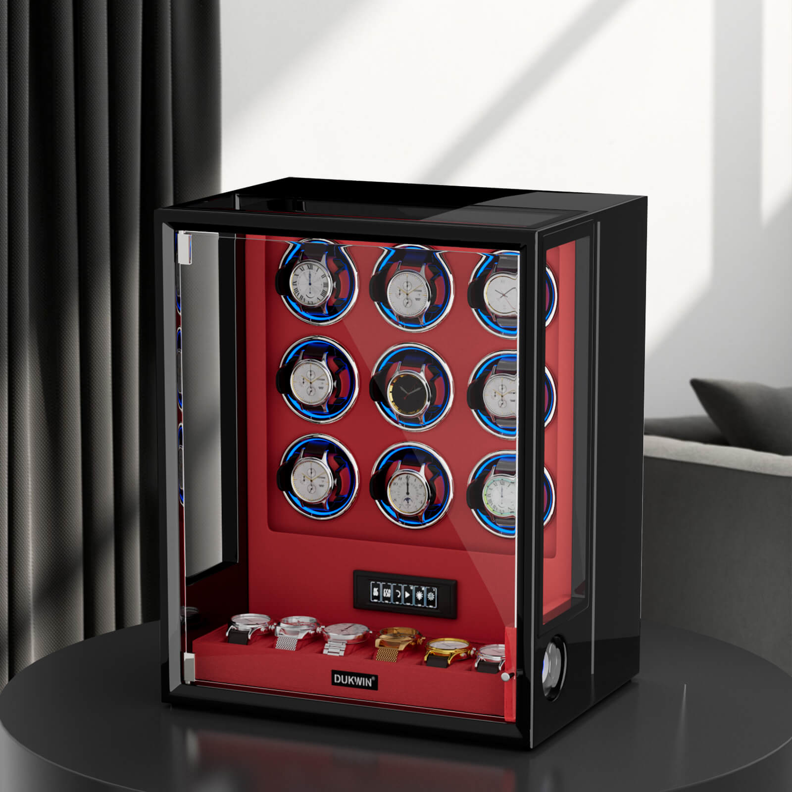 | Type | Extra Watches Storage, Fingerprint Unlock, RGB light, Remote Control, LCD Touchscreen, Ambient Blue Light |