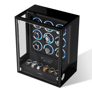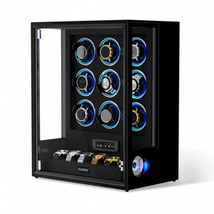 Patented Innovation: The VIRTUOSO watch winder for 6/9 watches impresses with the latest technology and outstanding workmanship, ensuring that each individual watch winder meets the highest standards, the selected solid wood is finished with the utmost care and refined craftsmanship with an exquisite piano lacquer and tempered glass door.